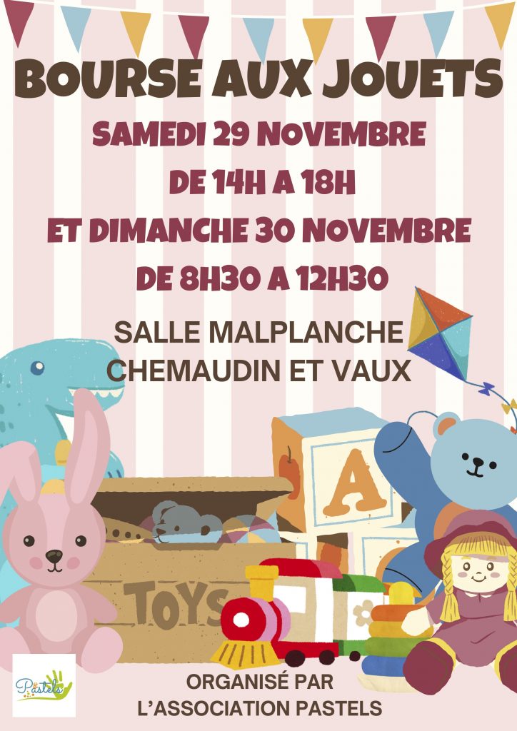L’association Pastels organise une bourse aux jouets samedi 29 novembre de 14 h à 18 h et dimanche 30 novembre de 8h30 à 12h30 à la salle Malplanche.