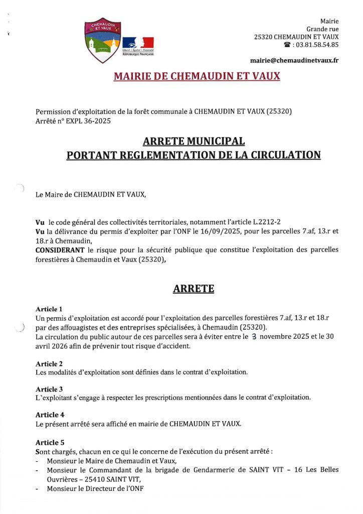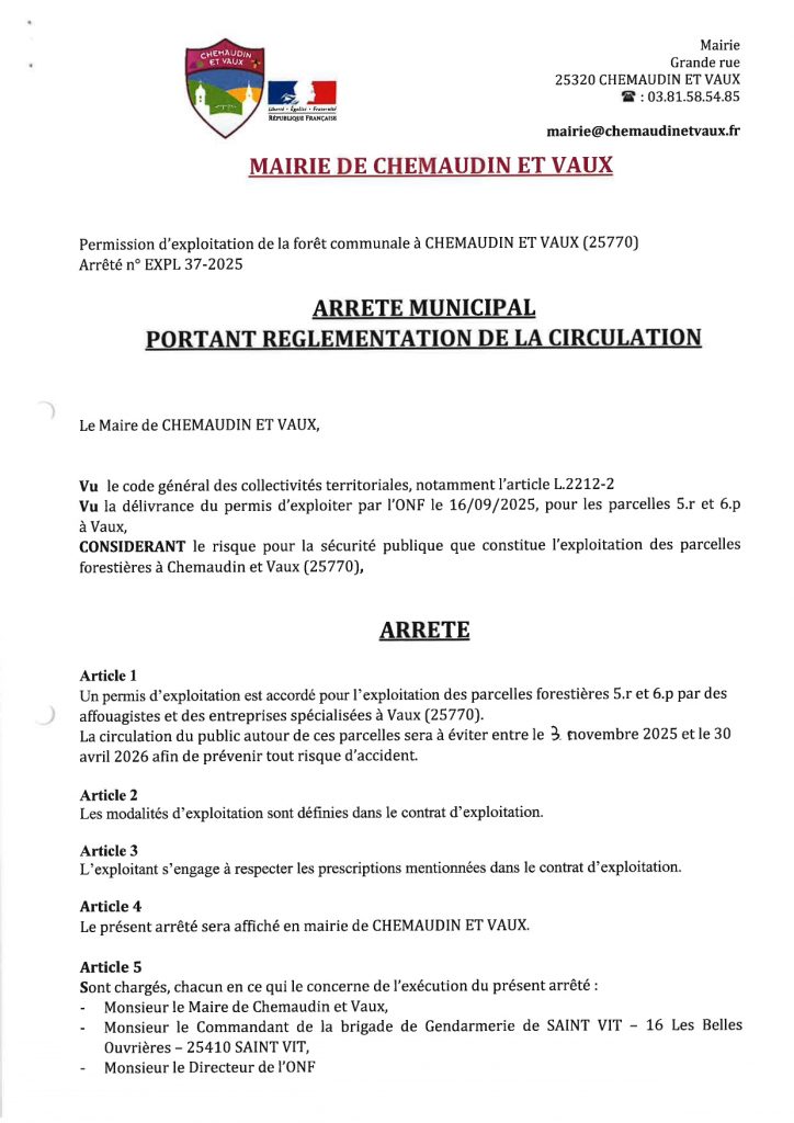 La mairie vous informe que deux permis d’exploitation ont été accordées à L’ONF sur les parcelles 7af, 13r et 18r dans le quartier de Chemaudin et à des entreprises spécialisées et affouagistes sur les parcelles 5r et 6p quartier de Vaux les près.