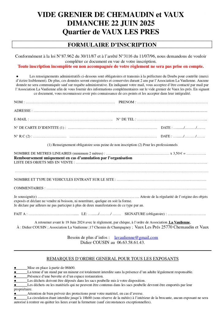 La Vaulienne organise son traditionnel vide-grenier le dimanche 22 juin prochain Secteur du Chemin de Champagney à Vaux les Prés. Vous trouverez ci-joint le formulaire d’inscription (date limite fixée au 19 juin 2025).
